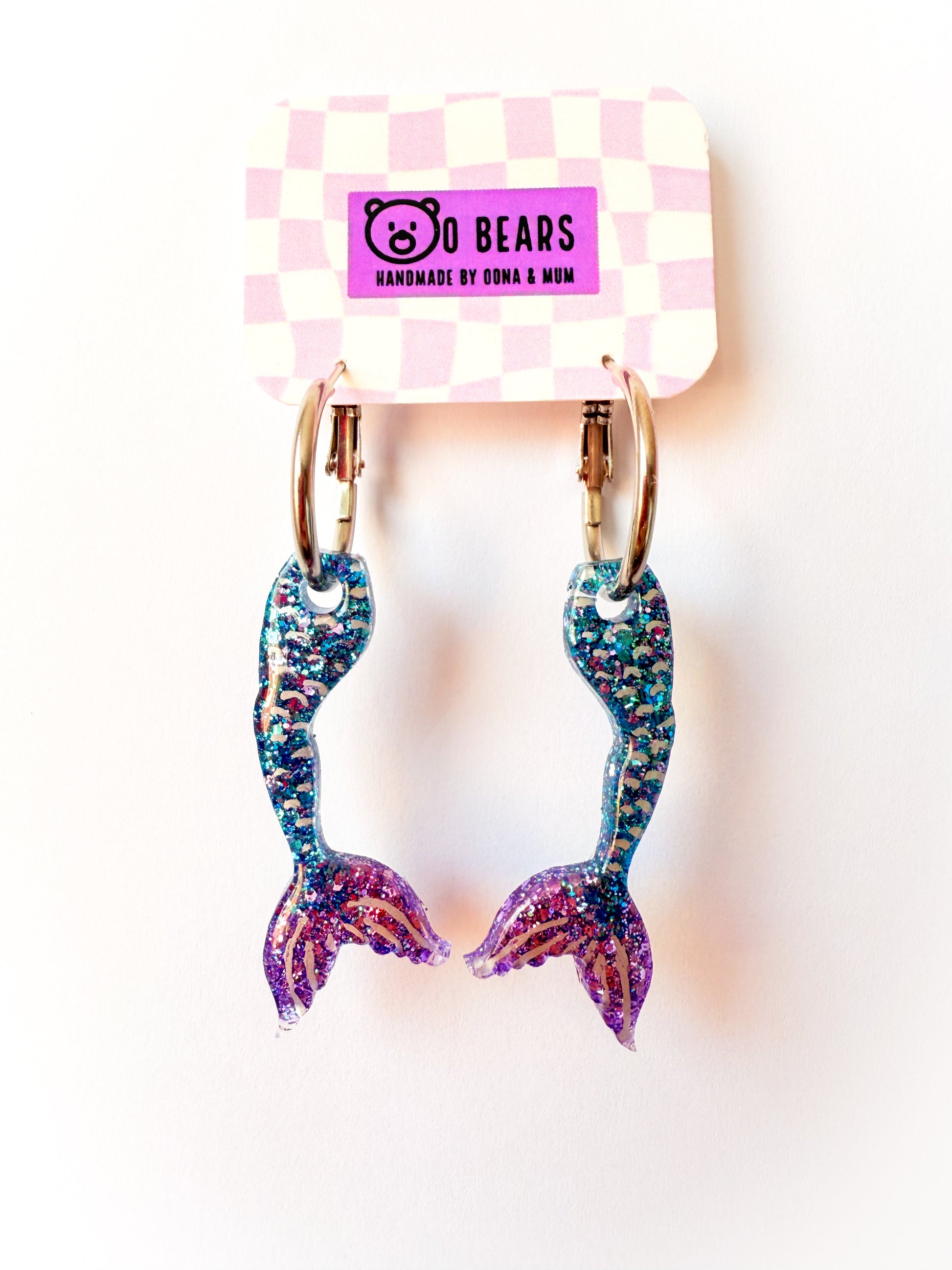 These beautifully crafted Mermaid Tails are the perfect addition to your wardrobe. Made with resin and shimmering glitter with an eye-catching sparkle, they are sure to make a statement wherever you go. Complete your look with the included statement earrings for a truly magical touch. Transform into a mermaid and stand out in style with these luxurious tails.