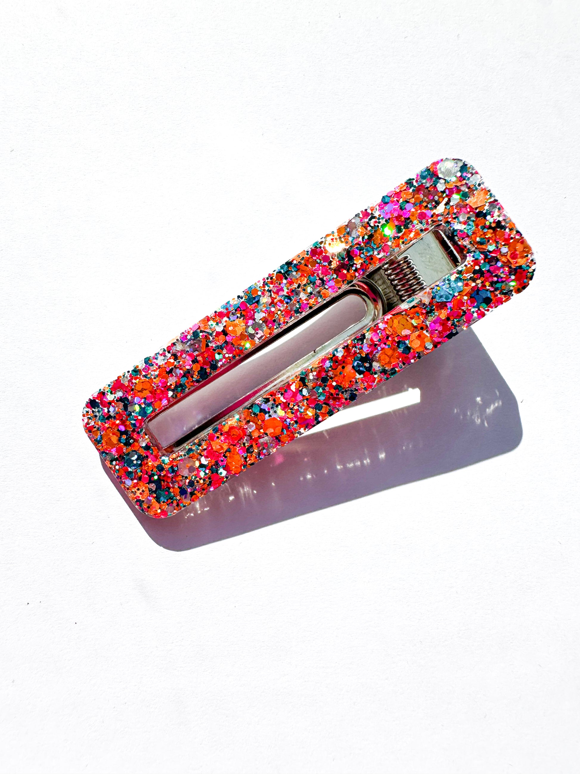 These clips are packed with multicoloured glitter. Tones of Pinks, orange, green and gold these really sparkle ✨