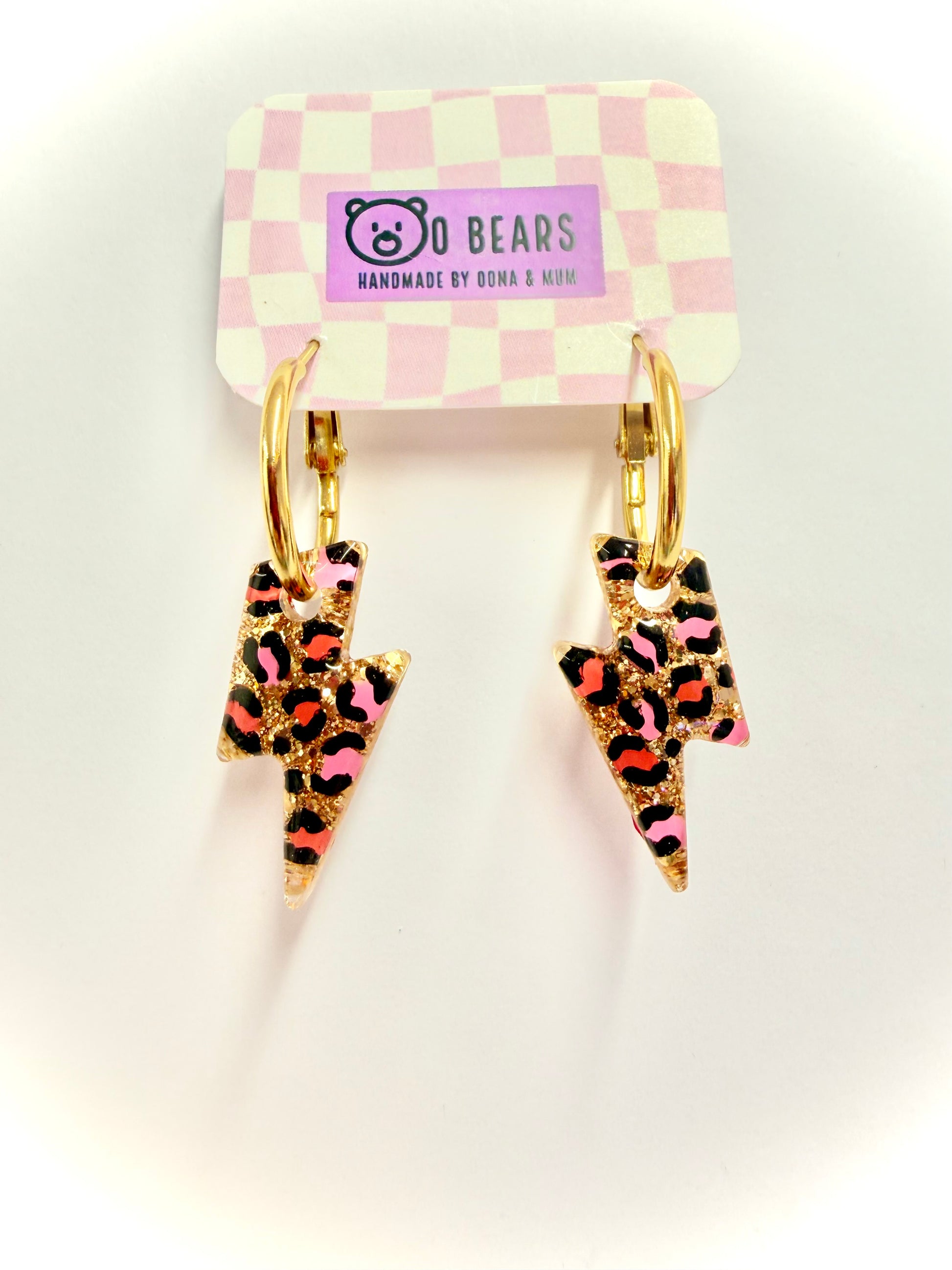 These leopard print Bolts have been hand painted using pink and red tones, finished off with a sparkling gold glitter.