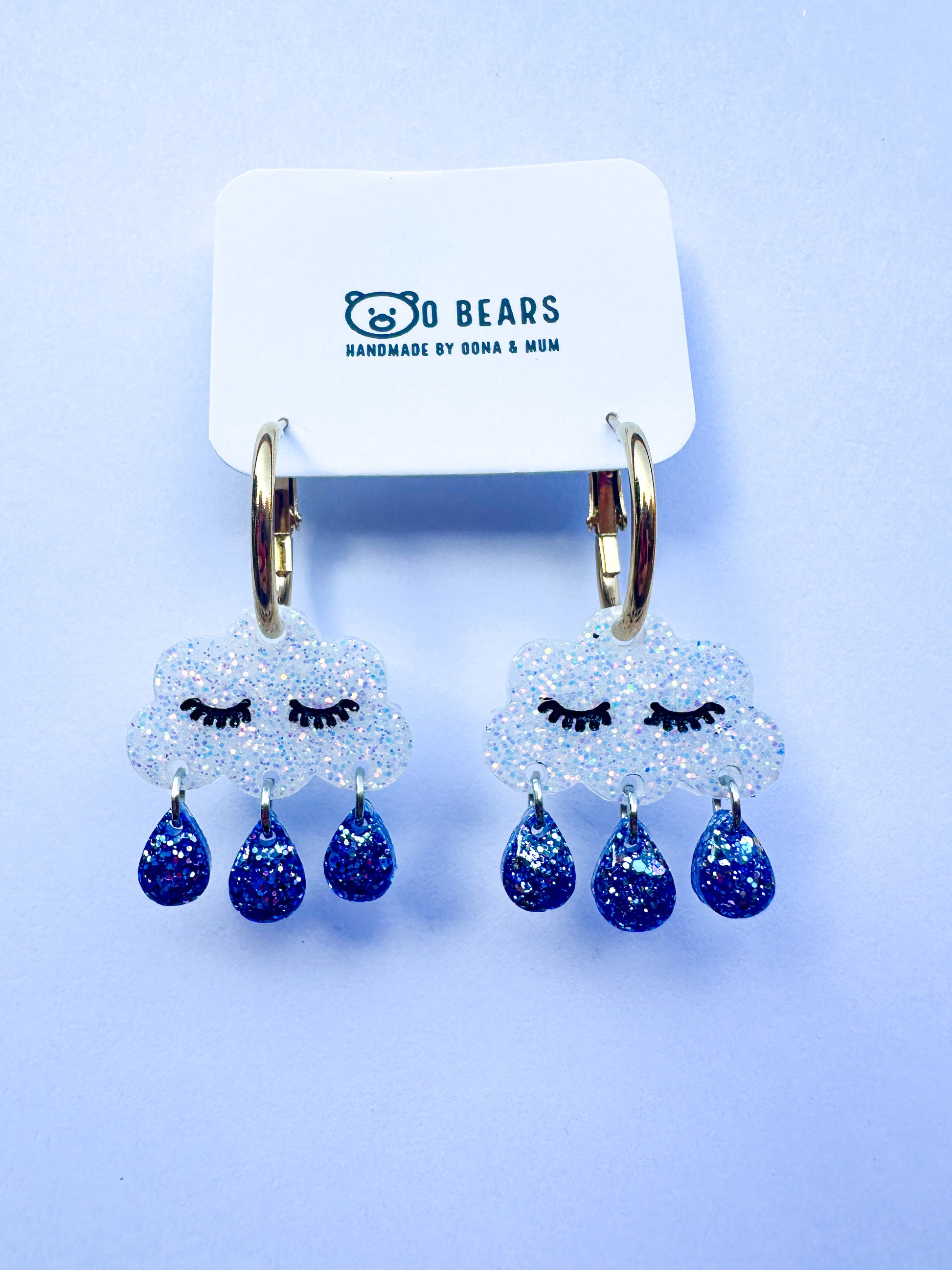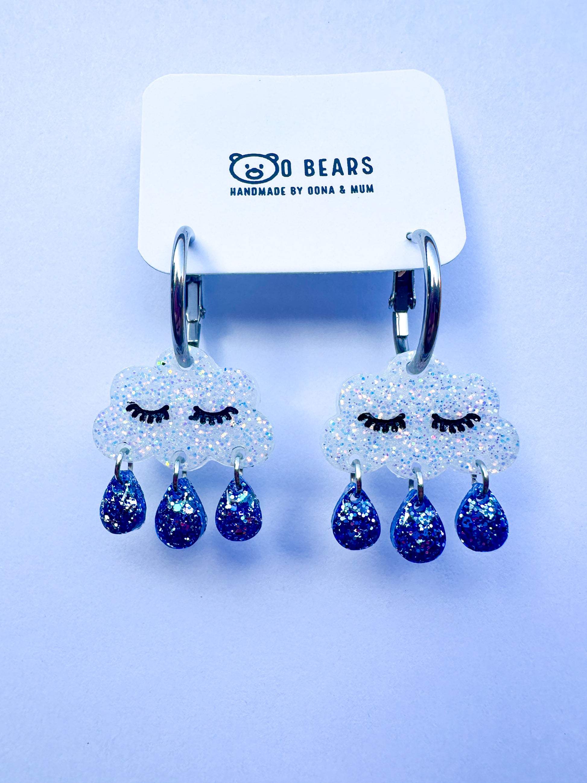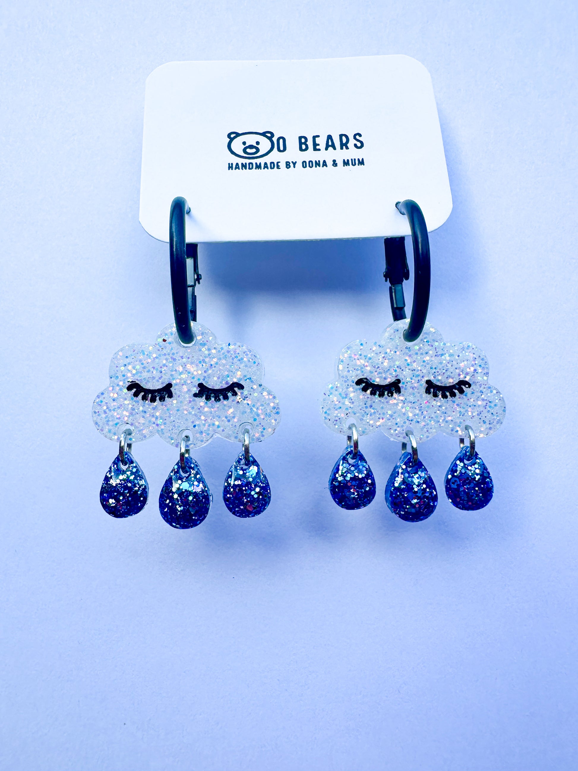 These rainy day hoops are made using white sparkling resin and glitter rain drops